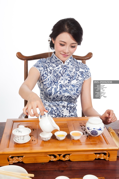 图片标题: 棚拍身穿旗袍的年轻女人茶艺表演