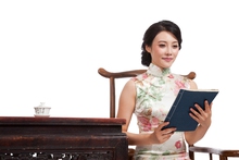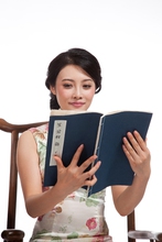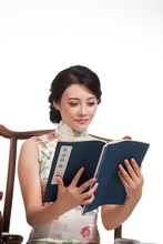 图片标题:     棚拍身穿旗袍的年轻女人看书