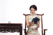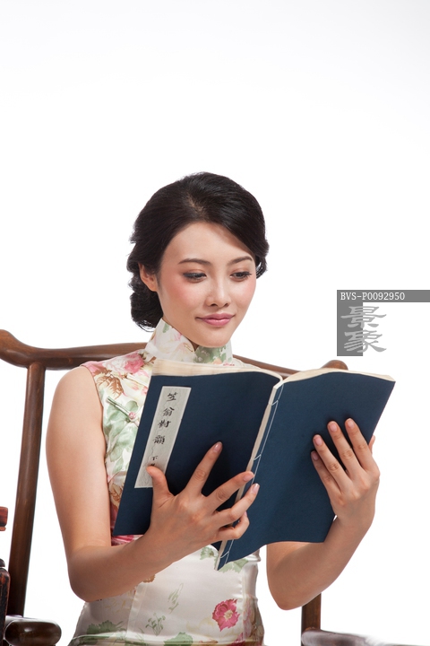 图片标题: 棚拍身穿旗袍的年轻女人看书