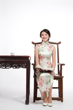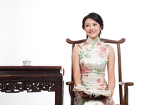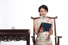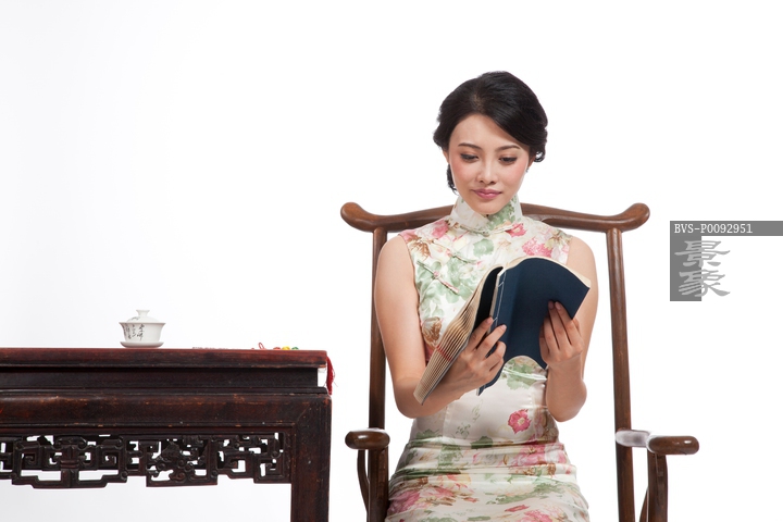 图片标题: 棚拍身穿旗袍的年轻女人看书
