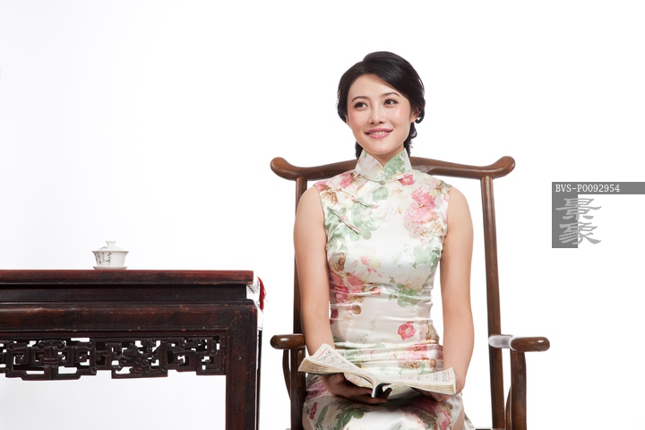 图片标题: 棚拍身穿旗袍的年轻女人看书