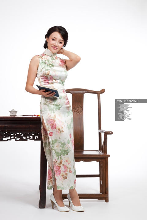 图片标题: 棚拍身穿旗袍的年轻女人和中式家具