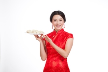 图片标题: 棚拍节日身穿红色旗袍的年轻女人端着饺子