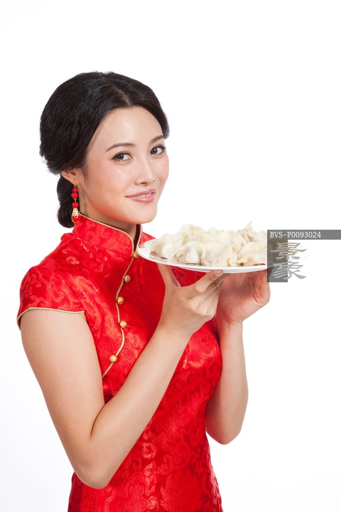图片标题: 棚拍节日身穿红色旗袍的年轻女人端着饺子
