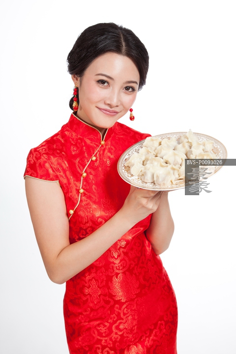 图片标题: 棚拍节日身穿红色旗袍的年轻女人端着饺子