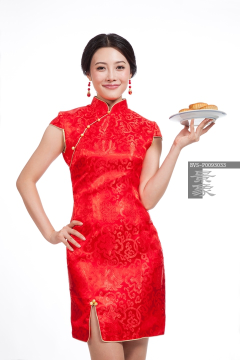 图片标题: 棚拍节日身穿红色旗袍的年轻女人端着月饼