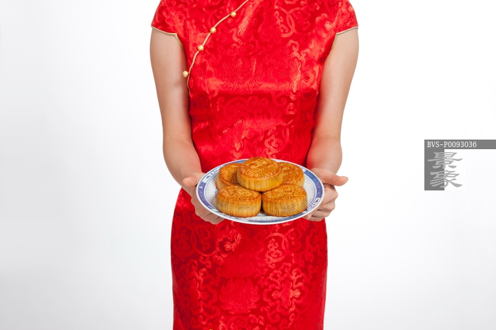 图片标题: 棚拍节日身穿红色旗袍的年轻女人端着月饼