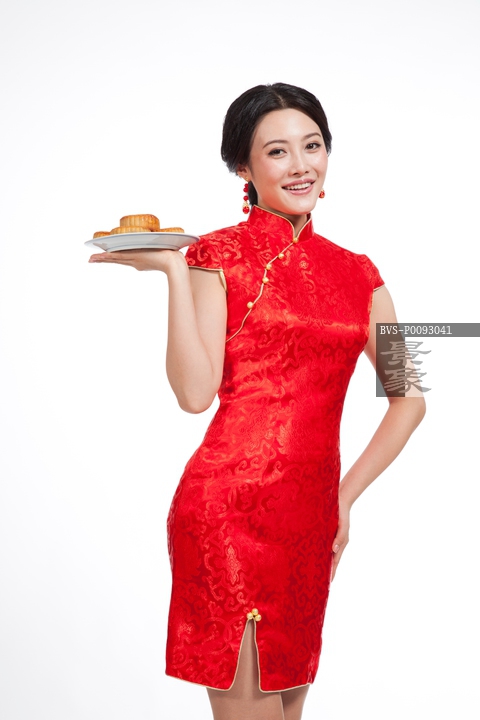 图片标题:     棚拍节日身穿红色旗袍的年轻女人端着月饼