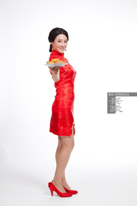 图片标题: 棚拍节日身穿红色旗袍的年轻女人端着月饼
