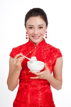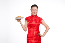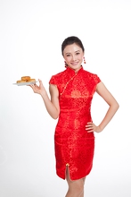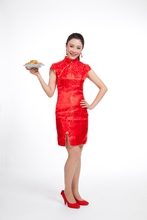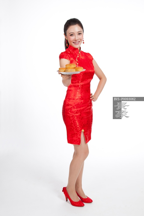 图片标题: 棚拍节日身穿红色旗袍的年轻女人端着月饼