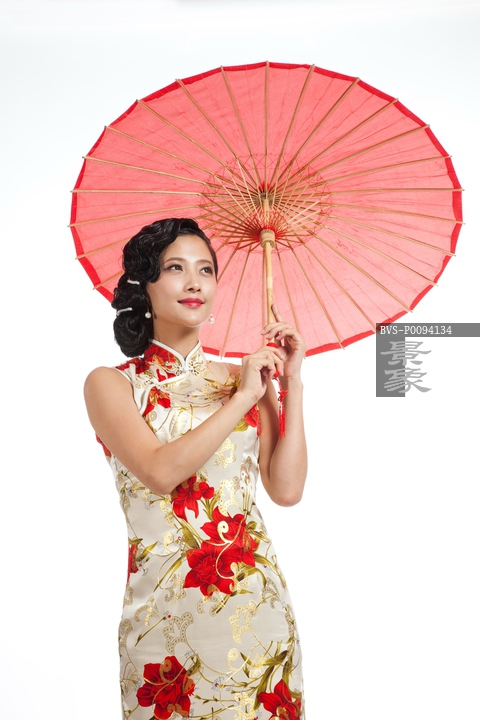 图片标题: 棚拍身穿旗袍的年轻女人和伞