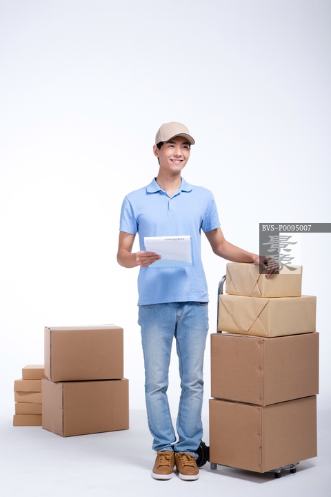 图片标题: 棚拍工作装年轻男快递员