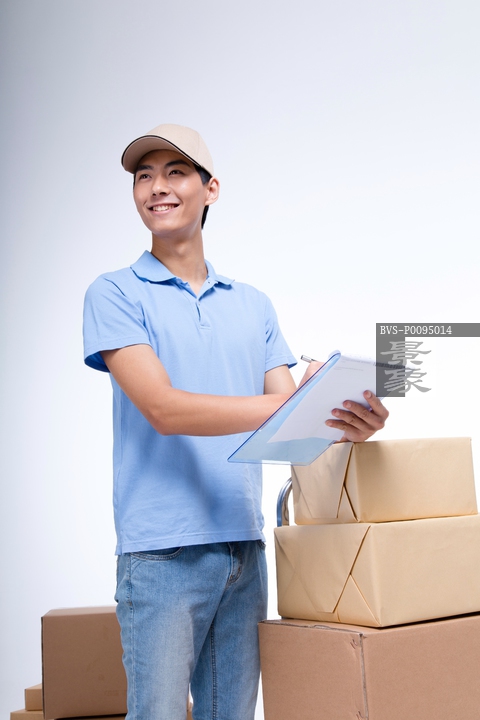 图片标题: 棚拍工作装年轻男快递员