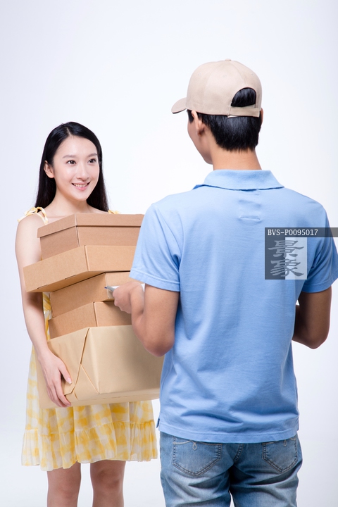 图片标题: 棚拍工作装年轻男快递员和女顾客