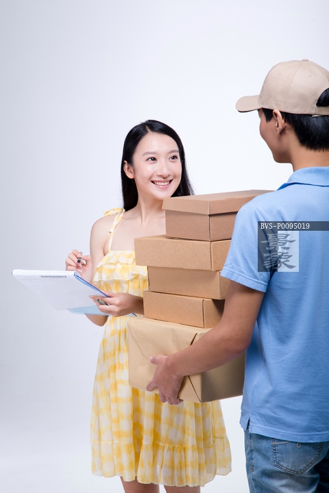 图片标题: 棚拍工作装年轻男快递员和女顾客