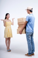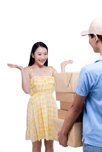 图片标题: 棚拍工作装年轻男快递员和女顾客