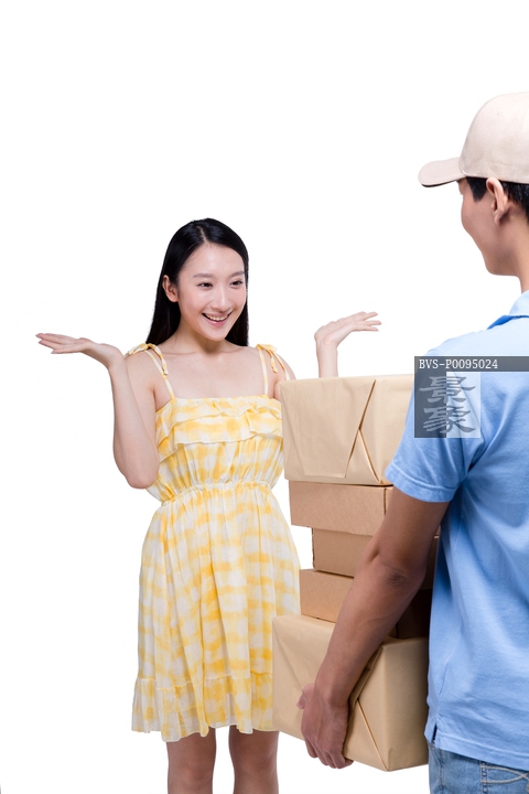 图片标题:     棚拍工作装年轻男快递员和女顾客
