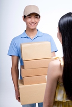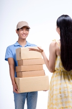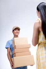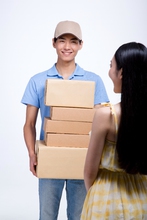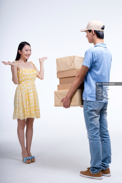 图片标题:     棚拍工作装年轻男快递员和女顾客