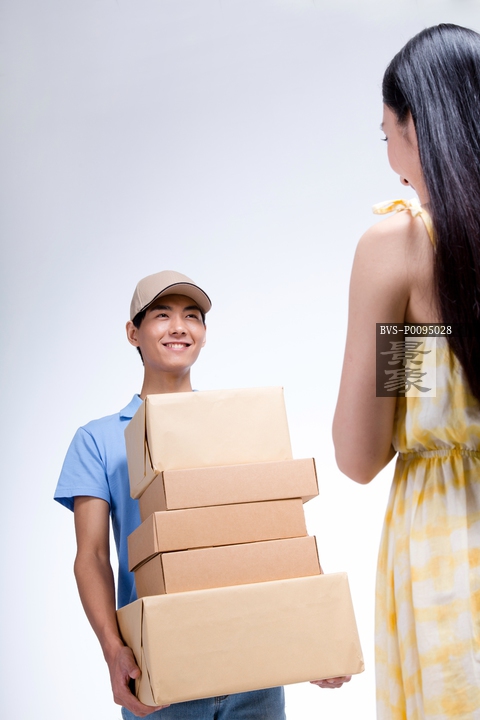 图片标题: 棚拍工作装年轻男快递员和女顾客