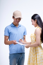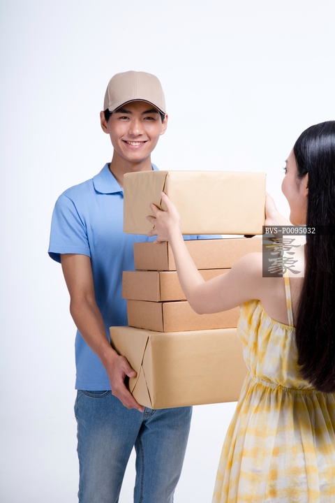 图片标题:     棚拍工作装年轻男快递员和女顾客