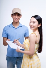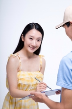 图片标题: 棚拍工作装年轻男快递员和女顾客