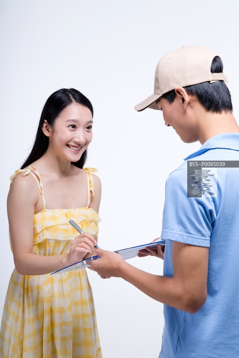 图片标题: 棚拍工作装年轻男快递员和女顾客