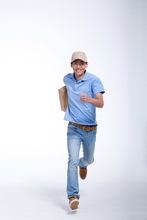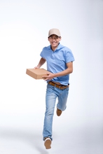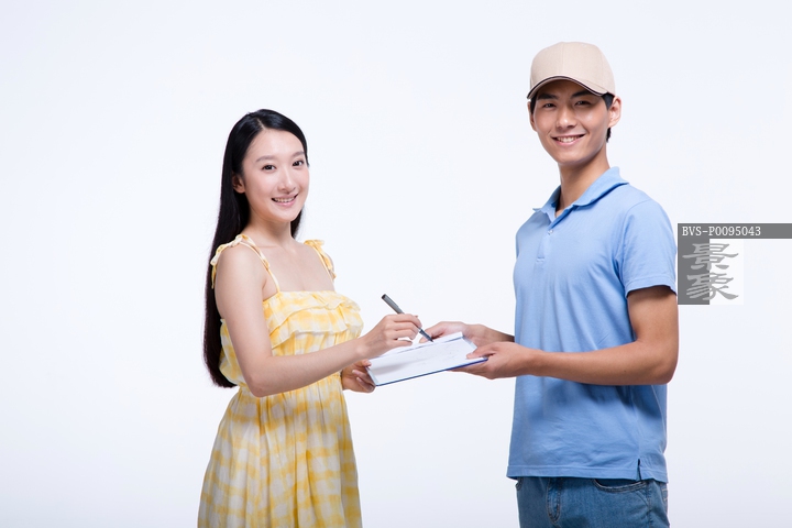 图片标题: 棚拍工作装年轻男快递员和女顾客