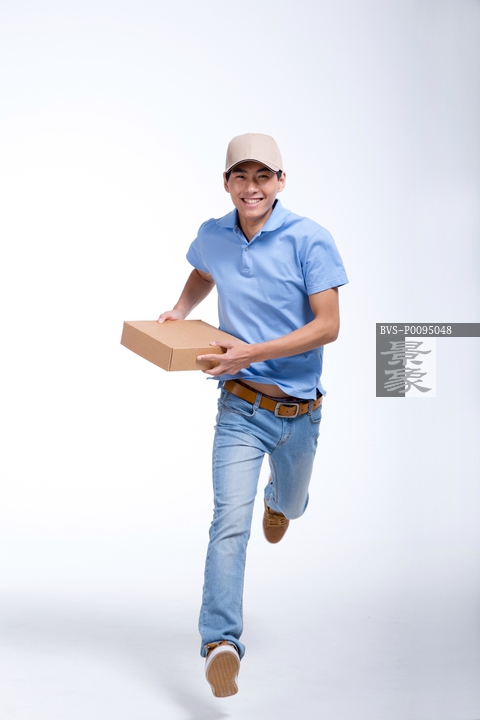 图片标题: 棚拍工作装年轻男快递员奔跑