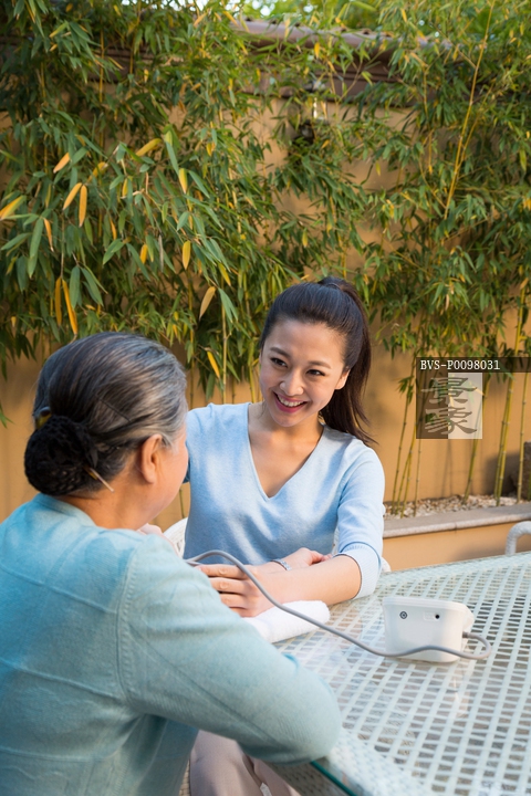 图片标题: 年轻女人给老年女人量血压