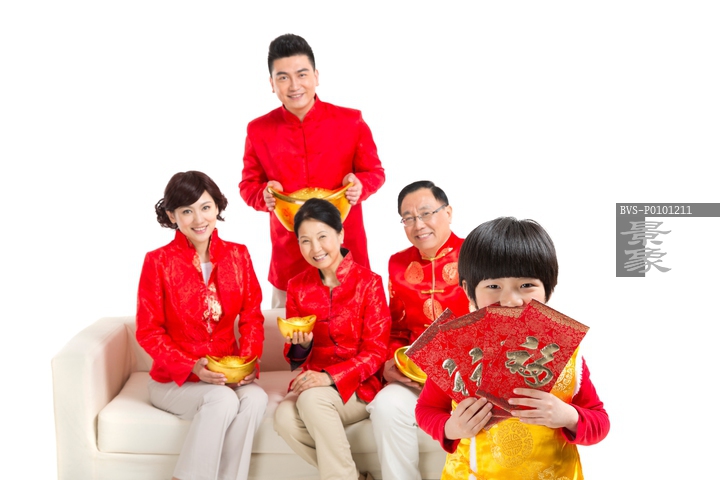 图片标题: 棚拍中国新年快乐的唐装家庭