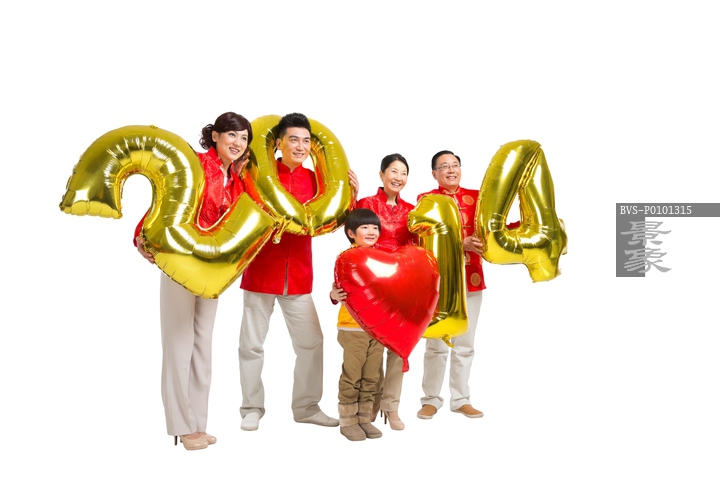 图片标题: 棚拍中国新年快乐的唐装家庭拿着数字气球