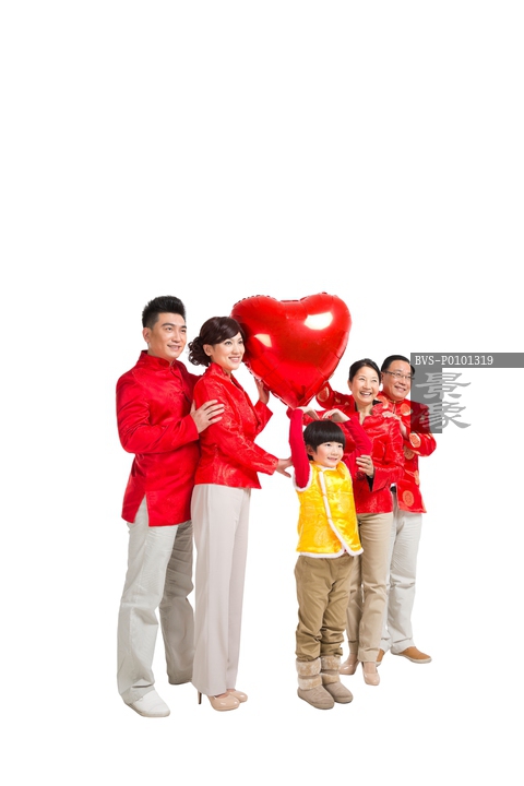 图片标题: 棚拍中国新年快乐的唐装家庭拿着红色桃心气球