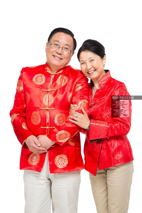 图片标题: 棚拍中国新年快乐的唐装老年夫妻