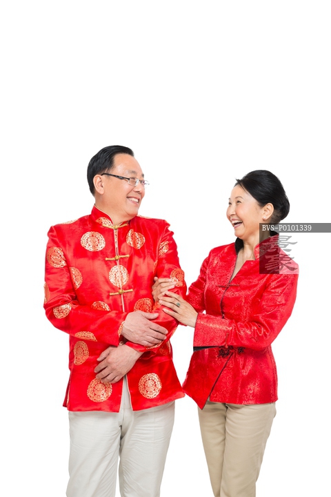 图片标题: 棚拍中国新年快乐的唐装老年夫妻