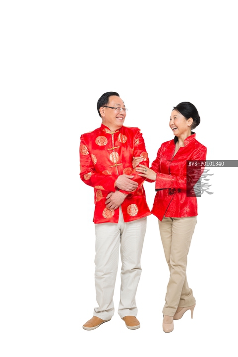 图片标题: 棚拍中国新年快乐的唐装老年夫妻聊天