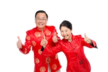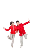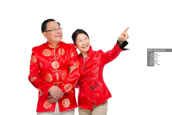 图片标题: 棚拍中国新年快乐的唐装老年夫妻聊天