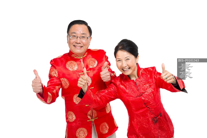图片标题: 棚拍中国新年快乐的唐装老年夫妻