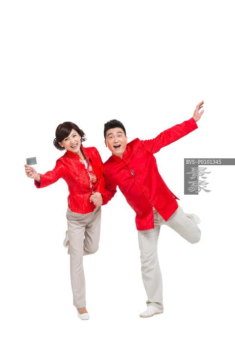 图片标题: 棚拍中国新年快乐的唐装夫妻