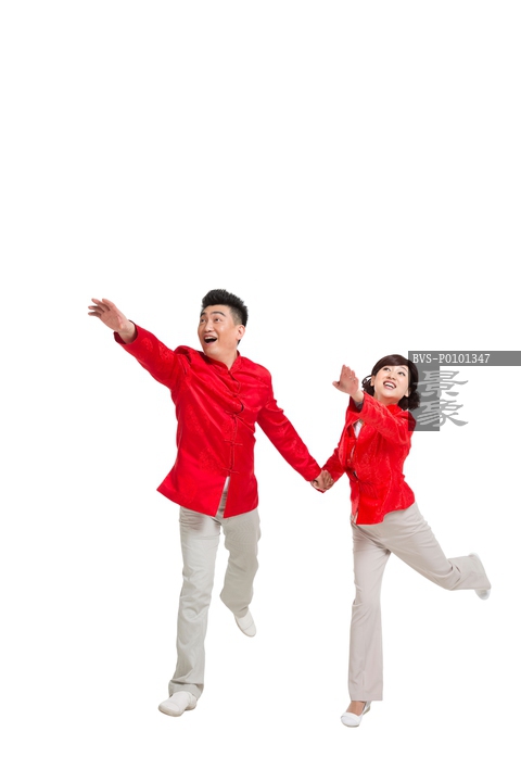 图片标题: 棚拍中国新年快乐的唐装夫妻
