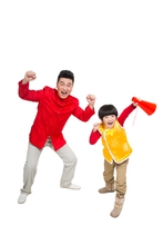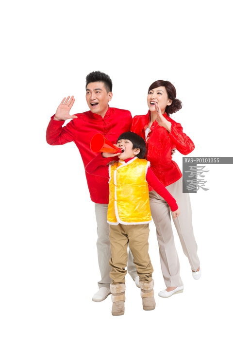 图片标题: 棚拍中国新年快乐的唐装一家三口