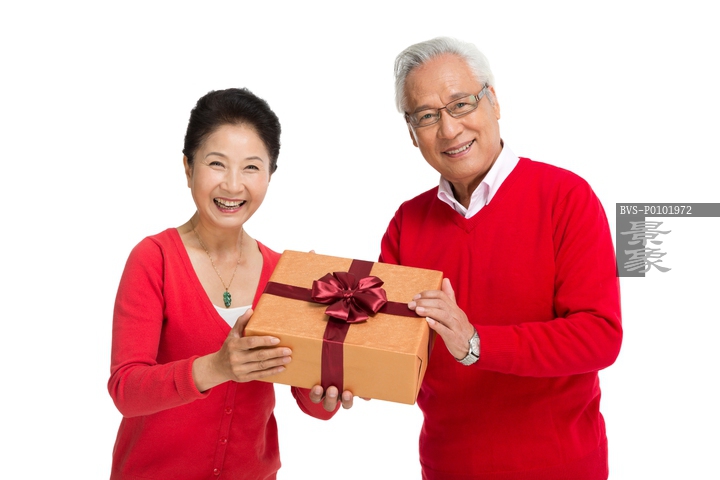 图片标题: 棚拍老年人抱着礼盒