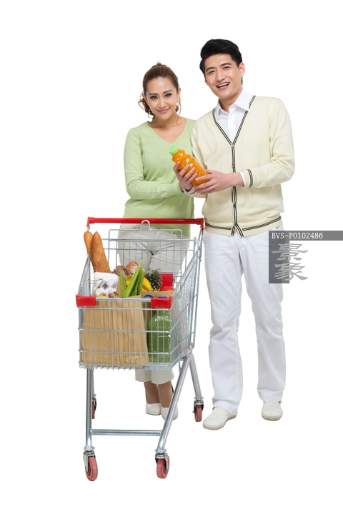 图片标题: 棚拍年轻情侣推购物车购物