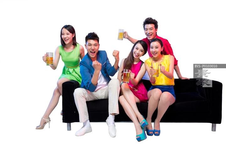 图片标题: 棚拍时尚活力年轻人聚会喝啤酒欢呼