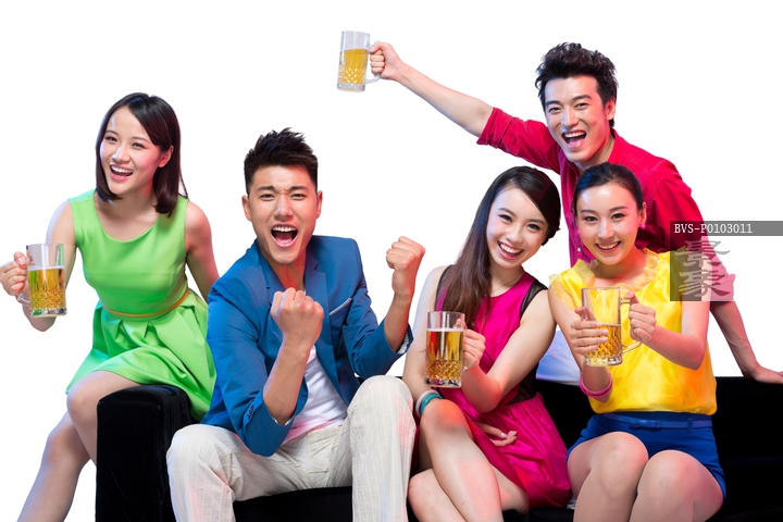 图片标题: 棚拍时尚活力年轻人聚会喝啤酒欢呼