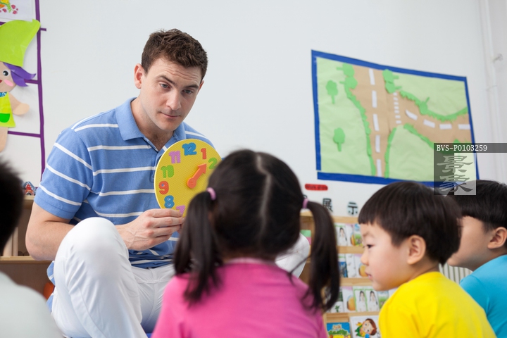 图片标题:     幼儿园外教男老师教小朋友们认识时钟
