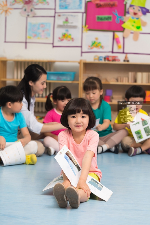 图片标题: 幼儿园儿童坐在地板上看故事书