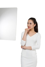 图片标题: 棚拍高科技研究人员使用触摸屏