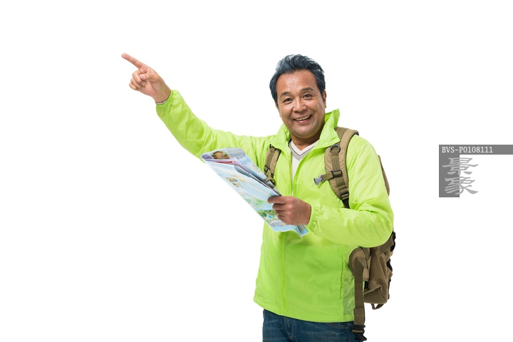 图片标题: 快乐的中老年人拿着地图指向远方