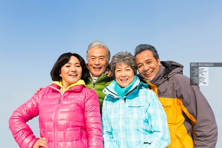 图片标题: 快乐的老年人冬季户外旅行