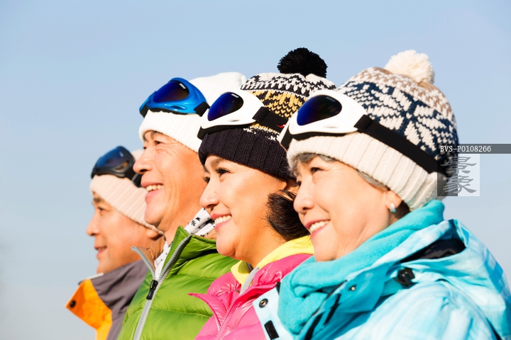 图片标题: 快乐的老年人冬季滑雪
